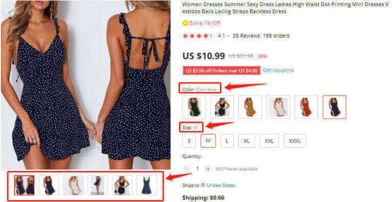 Step 10: Click and choose the color, product size, and quantity you want. Suppose here a one-piece (quantity) dark blue (color) summer dress is selected in a medium (M) size.