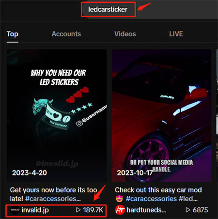 When browsing “LED car stickers” on TikTok, the first hot video is posted by Invalid. Currently, Invalid.jp has 160.8K followers and 3.7M likes on TikTok.